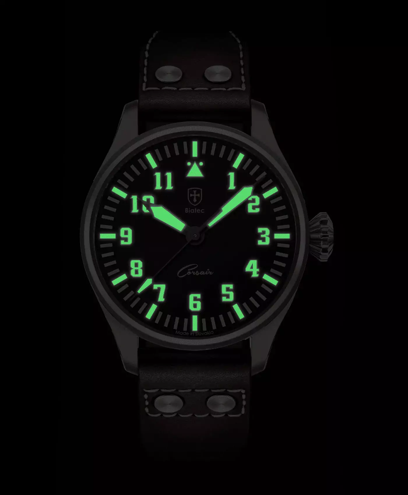 Inspiriert vom legendären Kampfflugzeug F4U Corsair fängt die Corsair-Kollektion die Essenz der Luftfahrtgeschichte und zeitlosen Designs ein. Diese Uhren wurden für Piloten und Enthusiasten gleichermaßen entwickelt und sind sowohl funktional als auch vielseitig und spiegeln die Präzision und Zuverlässigkeit wider, die Piloten während ihrer Missionen verlangen. Der durch den transparenten Gehäuseboden sichtbare, maßgeschneiderte Propellerrotor ist eine Hommage an den legendären Propeller der Corsair.