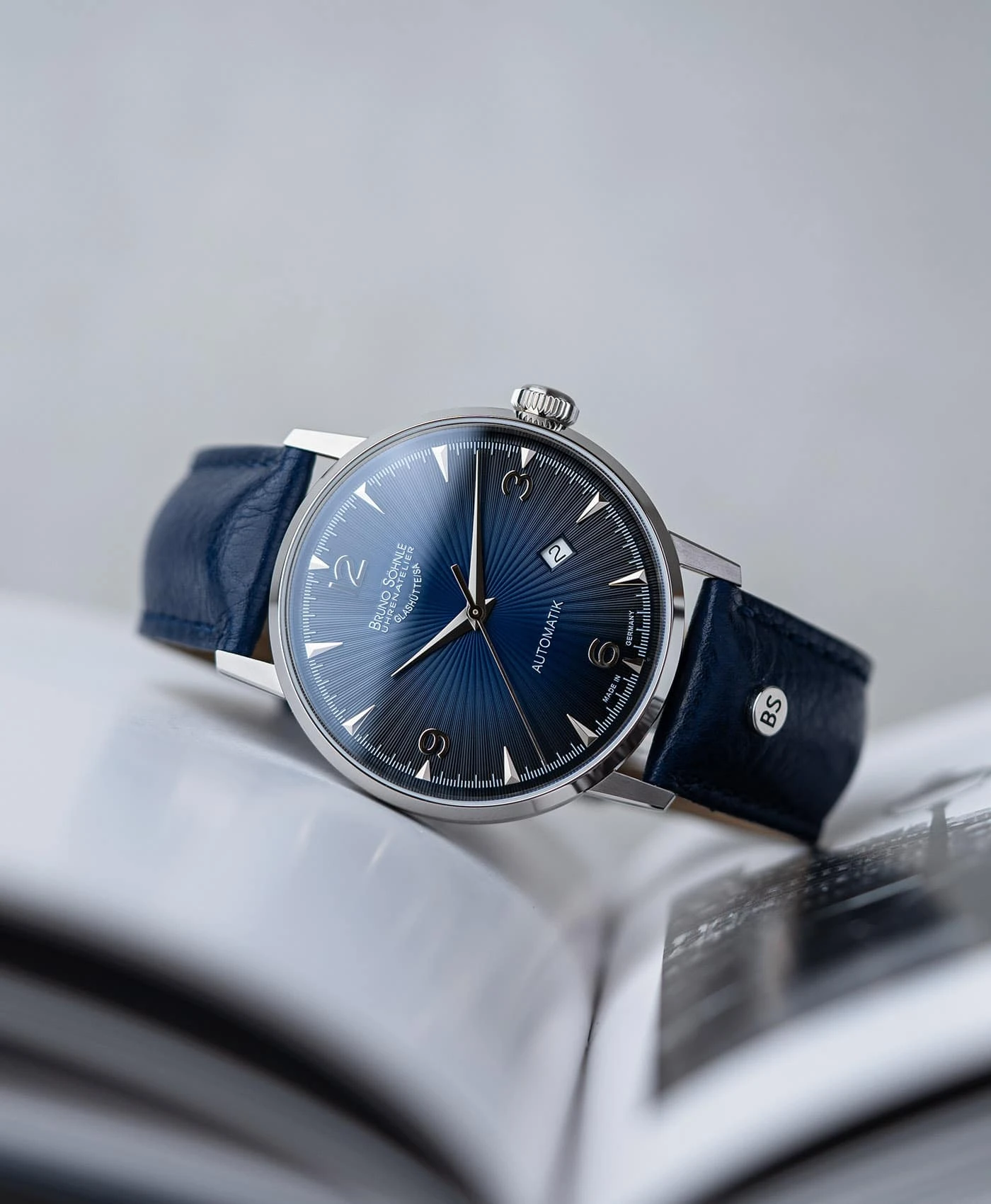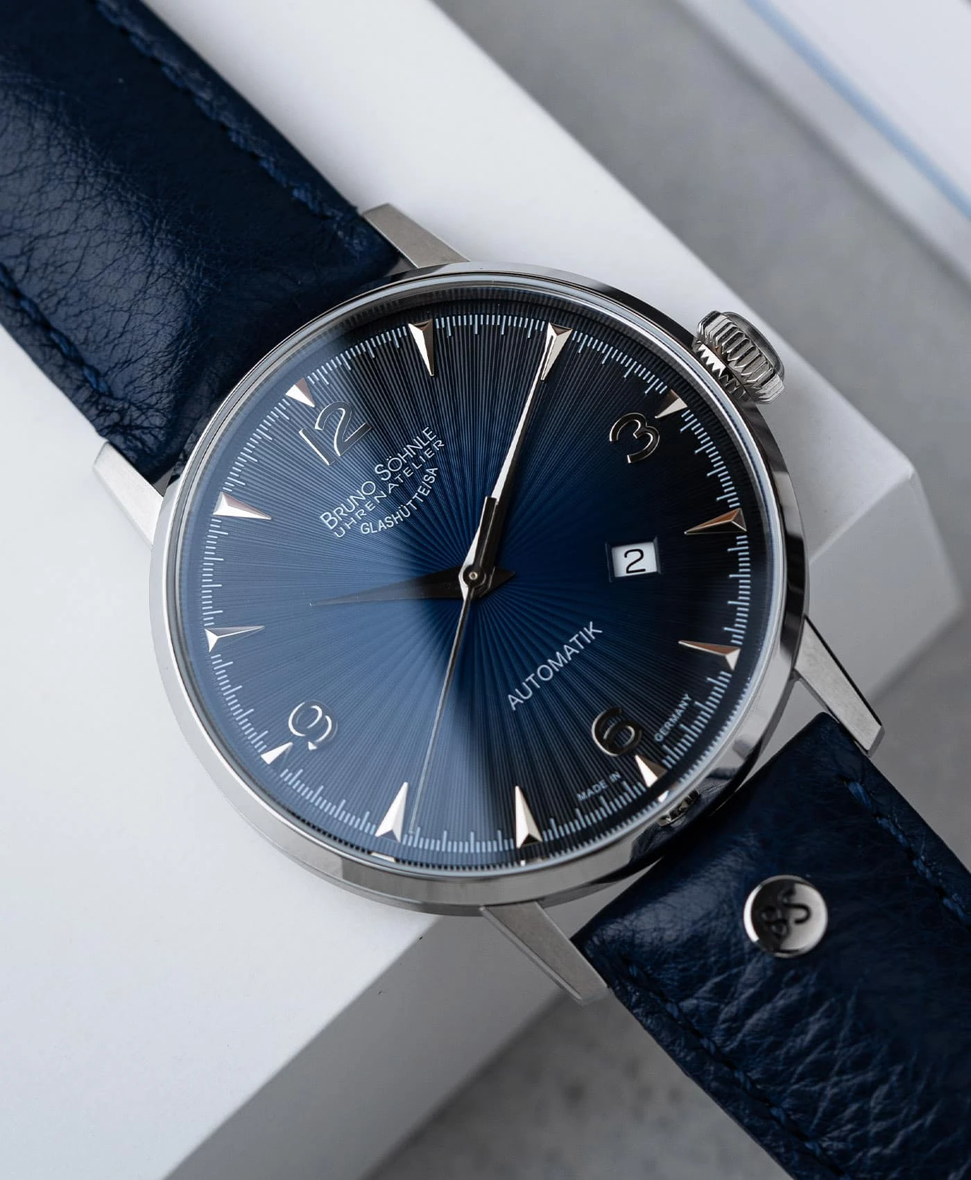 Die Bruno Söhnle Glashütte Stuttgart Automatik II Big steht mit ihrem speziellen Fumé-Zifferblatt, das von einer helleren Mitte zu einem dunkleren Rand übergeht, für zeitlose Eleganz. Das Zifferblatt verfügt über ein faszinierendes Guilloché-Strahlenmuster, das ein Wechselspiel aus Licht und Schatten erzeugt, das seine visuelle Tiefe verstärkt. Klassische dreieckige, hochglanzpolierte Indizes verleihen einen Hauch von Vintage-Eleganz. Angetrieben vom automatischen Atelier-Kaliber BS175 (basierend auf Sellita SW200) verfügt diese Uhr über ein sportliches 42,5-mm-Edelstahlgehäuse und ein schlankes 10,9-mm-Profil. Mit 5 bar Wasserdichtigkeit, Saphirglas mit Antireflexbeschichtung und einem blauen, fein strukturierten Kalbslederarmband mit Ziernähten und einer Dornschließe ist die Stuttgart Automatik II Big ein Meisterwerk Glashütter Handwerkskunst.