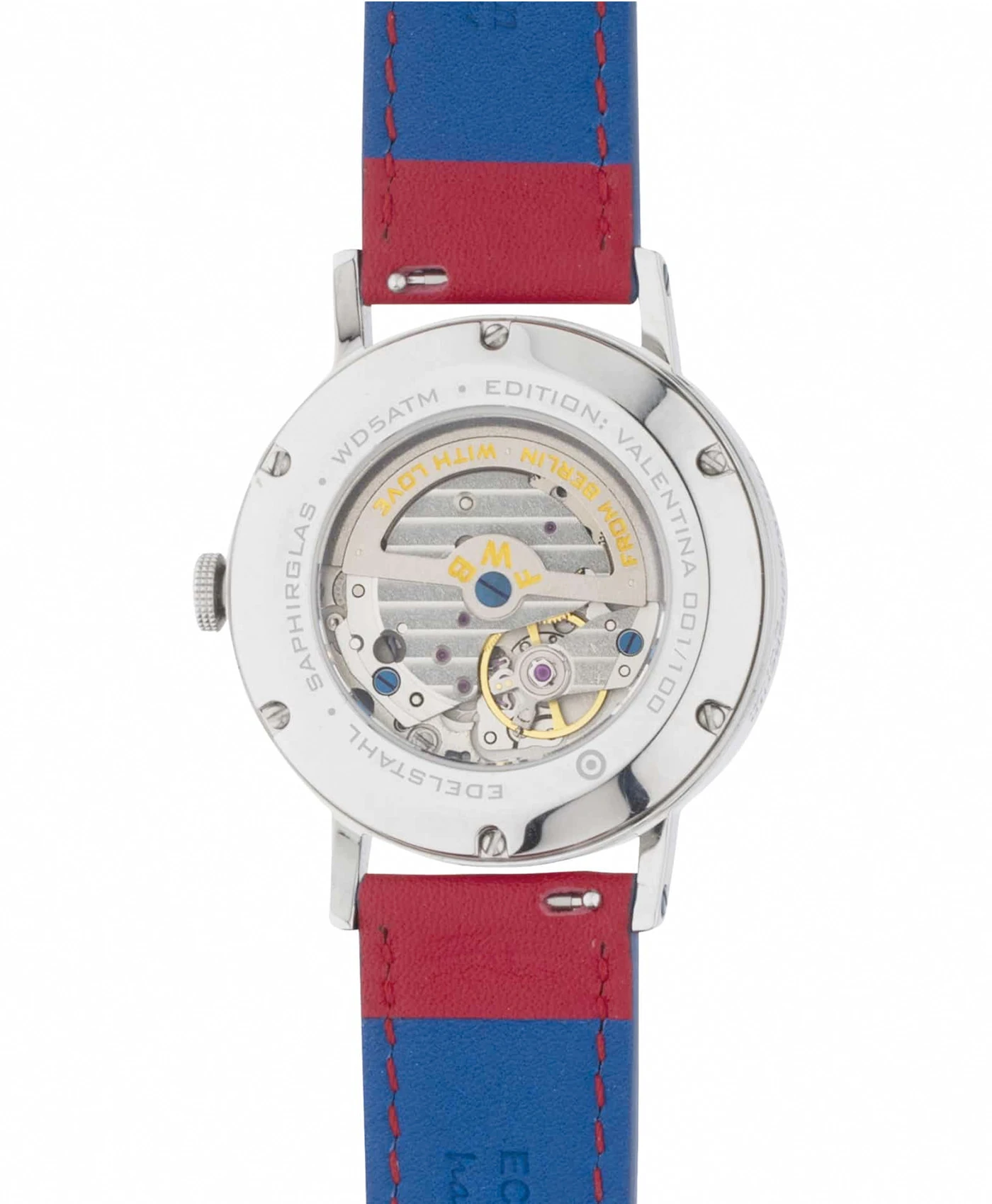 Ins Auge fällt die silberne Kante des tiefer gelegten Sekunden-Zifferblatt. Blaue Kreislinien umranden die Kleine-Sekunde und das gesamte Zifferblatt. Das handgearbeitete rote Lederband ist an der Uhr montiert und ein blaues Lederband liegt separat bei.