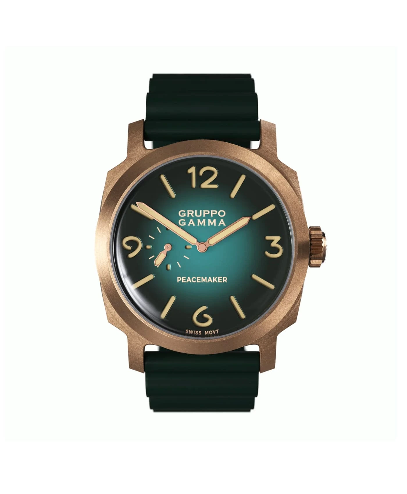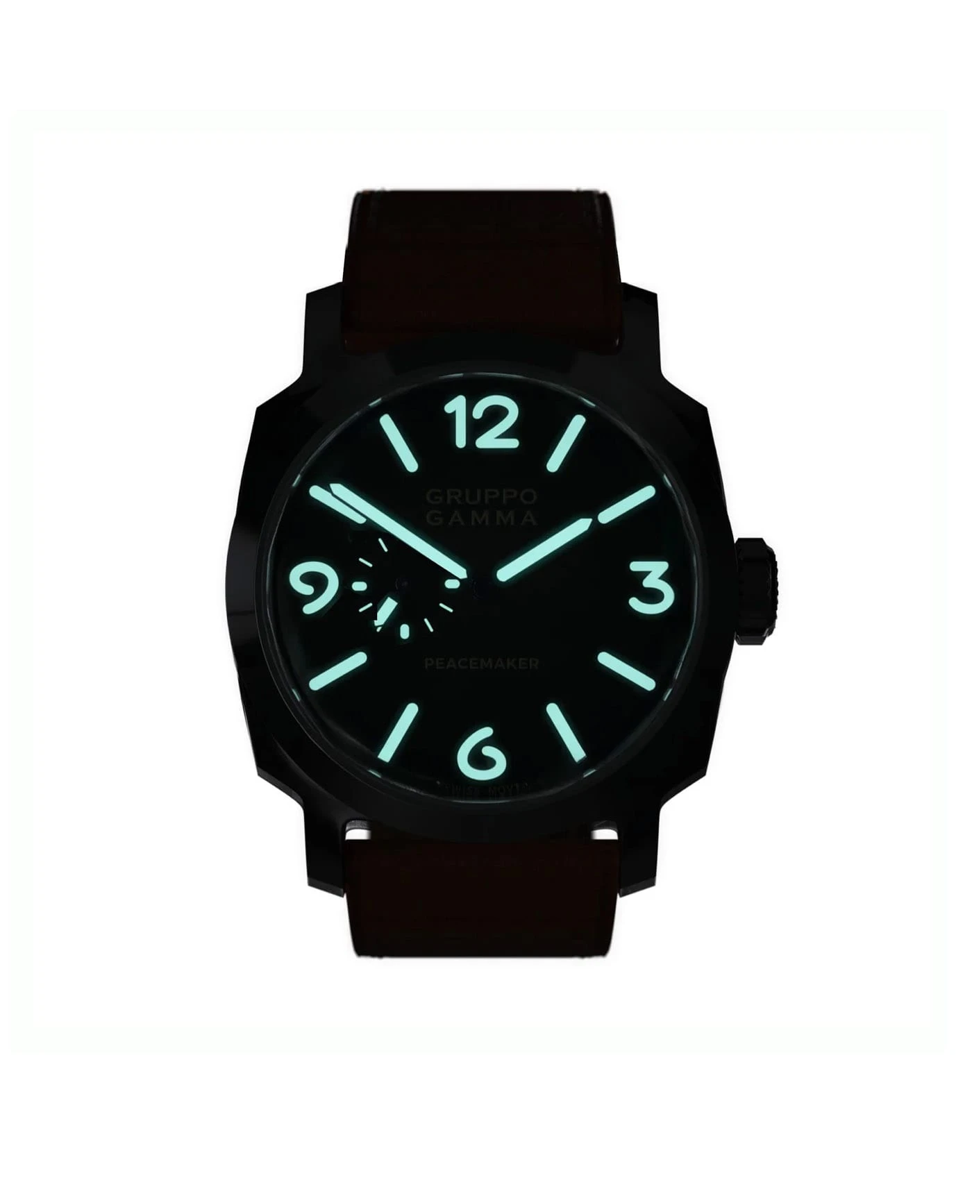 Der Peacemaker von Gruppo Gamma will das berühmte italienische Design der Militär-Taucheruhren Taucheruhren wieder aufleben lassen. Die Uhr kommt am italienischen Premium-Lederarmband von Simona Di Stefano, handgefertigt in Florenz und kann auch mit WatchBandit Original Uhrenarmbänder kombiniert werden. Schweizer Super-LumiNova auf Stunden-, Minutenzeigern und Stundenindexen sorgt für eine gute Ablesbarkeit bei Dunkelheit.