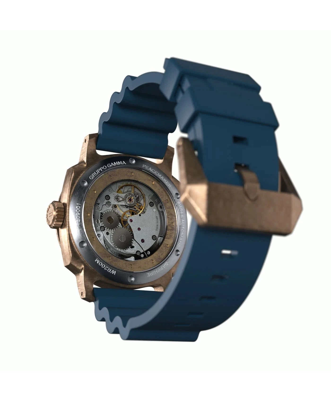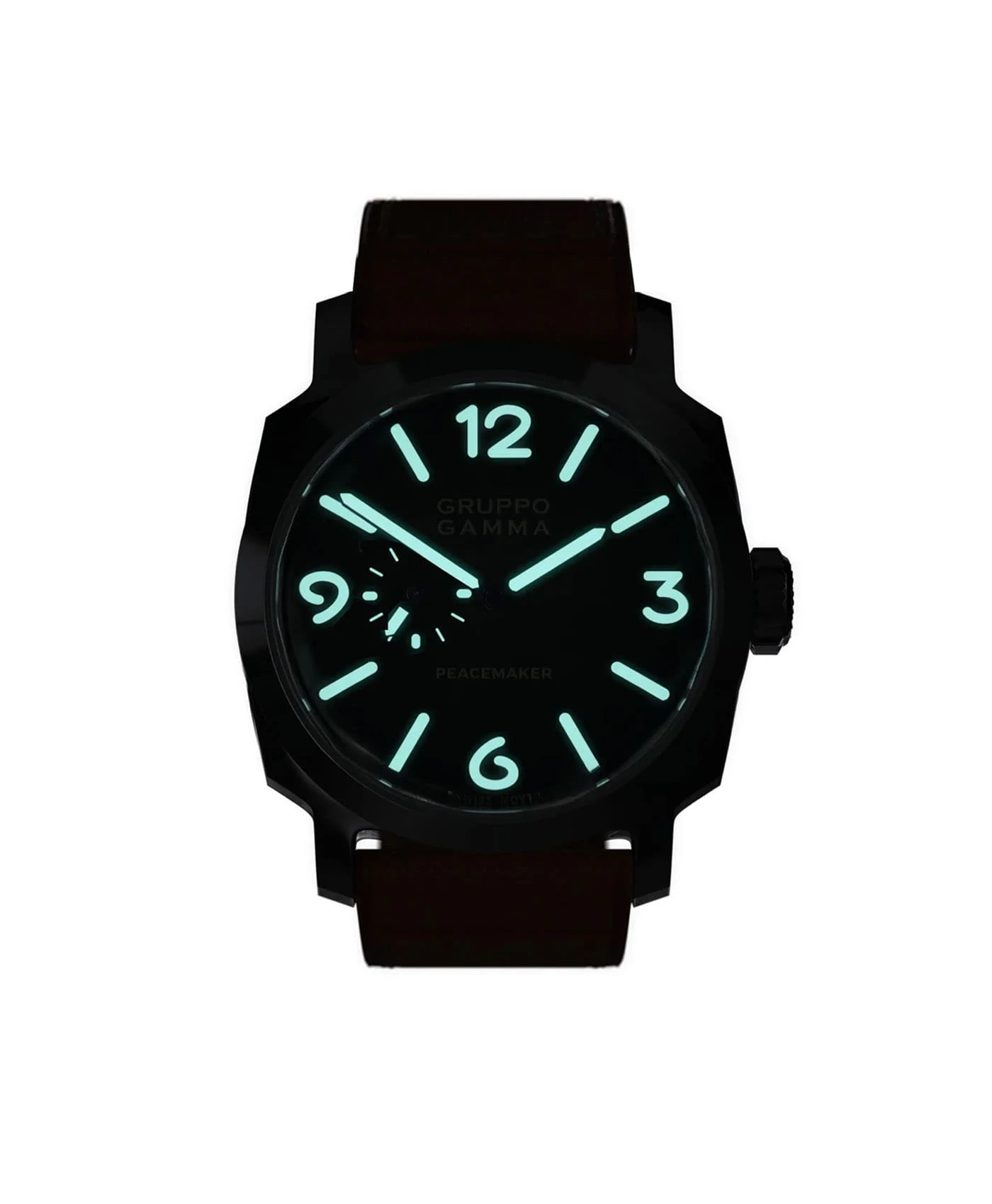 Der Peacemaker von Gruppo Gamma will das berühmte italienische Design der Militär-Taucheruhren Taucheruhren wieder aufleben lassen. Die Uhr kommt am italienischen Premium-Lederarmband von Simona Di Stefano, handgefertigt in Florenz und kann auch mit WatchBandit Original Uhrenarmbänder kombiniert werden. Schweizer Super-LumiNova auf Stunden-, Minutenzeigern und Stundenindexen sorgt für eine gute Ablesbarkeit bei Dunkelheit.