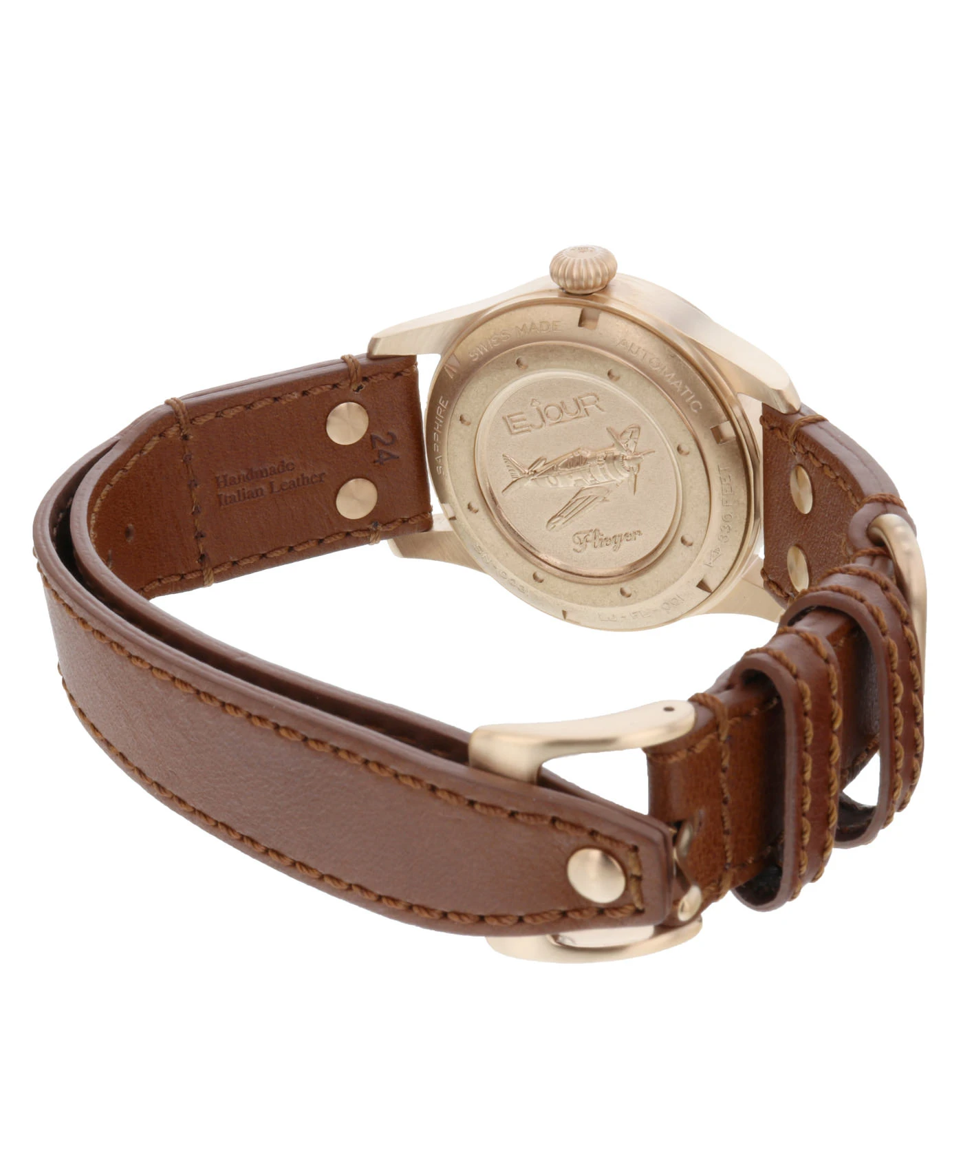 Das Le Jour Flieger Uhrengehäuse ist aus CuSn8-Bronze und satinmatt gebürstet. Mit der Zeit entwickelt die Bronzeoberfläche eine besondere Patina, ein herrlicher Look mit einem Hauch von Nostalgie. Das makellose Zifferblatt mit Zeigern und Indizes im Vintage-Stil bietet eine klare Lesbarkeit. Die Verwendung von Swiss Super-LumiNova C3 Leuchtmasse auf Zeigern und Indizes verbessert die Lesbarkeit in dunkleren Umgebungen. Das Premium-Lederband hat zwei Nieten am Laschenende und eine Niete am anderen Ende des Armbandes, um den Vintagestil perfekt abzurunden. Das zweigeteilte, mit einer Niete verschlossene Lederarmband bietet besondere Sicherheit und verhindert ein versehentliches Verrutschen und Herunterfallen der Uhr, wenn das Armband geöffnet wird. Zusätzlich wird ein schwarzes Nylonband geliefert, das für ein leichteres Gefühl und einen sportlicheren Look sorgt. Der Le Jour Flieger verfügt über ein kratzfestes Saphirglas mit Antireflexbeschichtung auf der Innenseite des Kristallglases. Eine verschraubte Krone und Gehäuseboden bringen die Uhr eine Wasserbeständigkeit von bis zu 10 bar / 100 Meter. Der Edelstahl-Gehäuseboden. Die Liebe steckt im Detail: Der Gehäuseboden hat eine Grafik eines Kampfflugzeugs eingraviert und ist mit einer IP-Roségold-Beschichtung versehen, die dem Aussehen des restlichen Gehäuses entspricht. Die Uhr wird von einem Schweizer Automatikwerk Sellita SW200 angetrieben