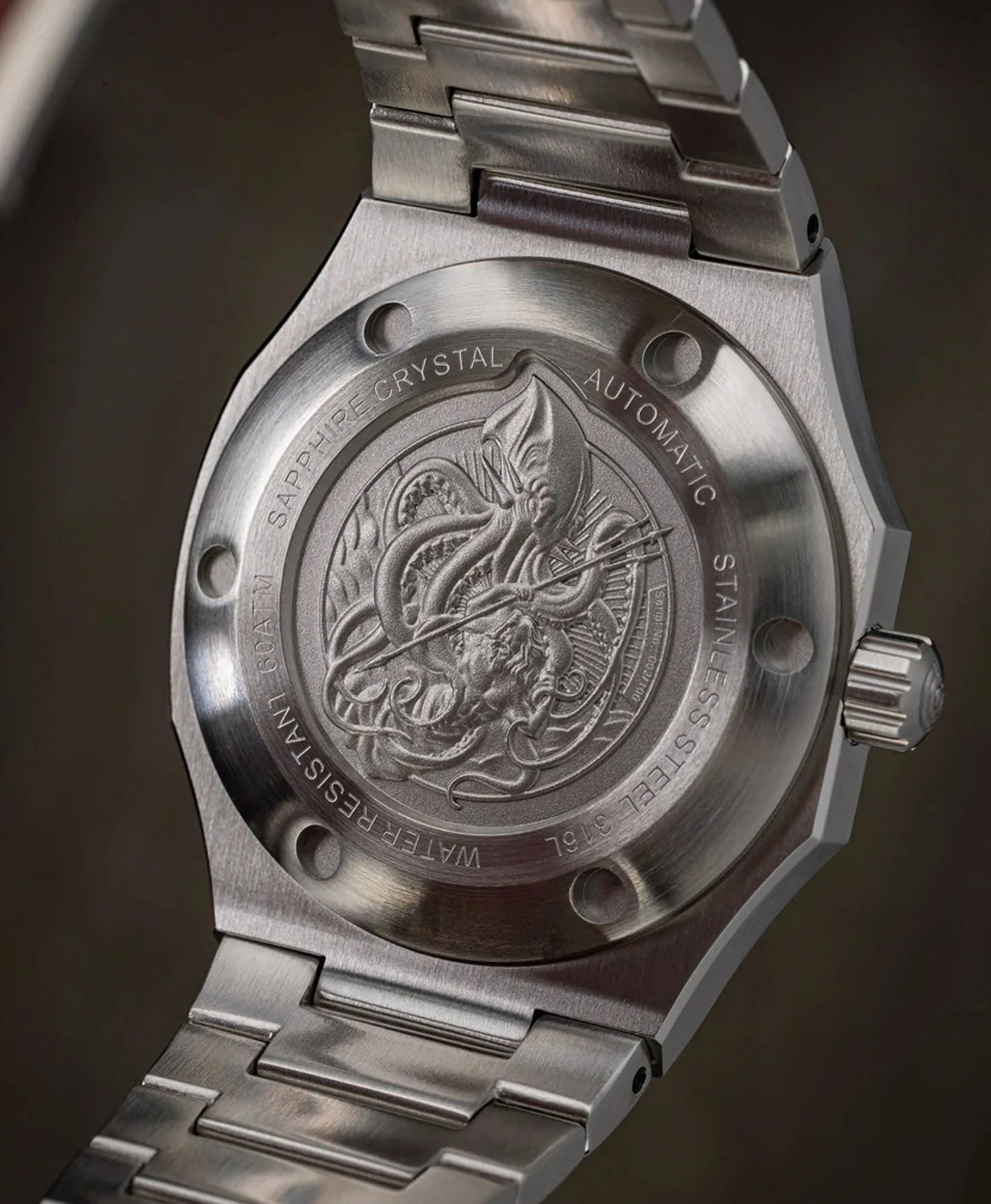 - Dickes Saphirkristallglas mit 4,0 mm Dicke. Das Glas ist mit einer Antireflexionsbeschichtung versehen, um Reflexionen unter Wasser zu verhindern.