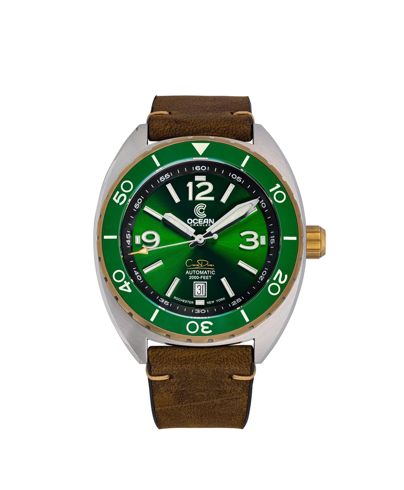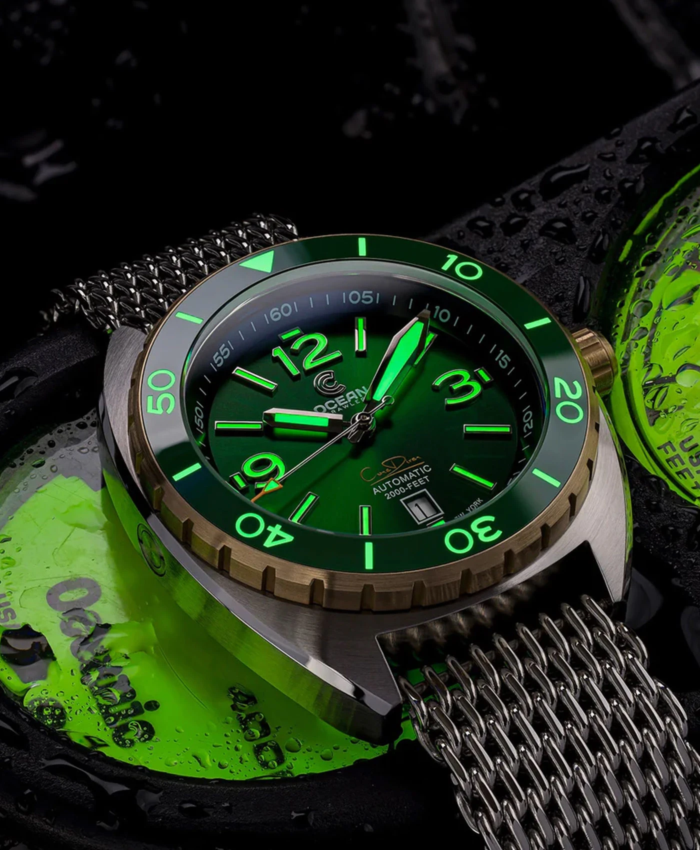 Jeder einzelne Ocean Crawler wurde in Wasser getaucht und gründlich getestet, um einem Druck von bis zu 2000 Fuß standzuhalten. Dies macht es zu einem unverzichtbaren Unterwasserzubehör für Wassersportler, die tauchen, Speerfischen betreiben und sogar den Meeresboden erkunden. Diese limitierte Sonderedition verfügt über ein Dekompressions-Timer-Zifferblatt, das die erforderlichen Dekompressionsstopps während eines Tauchgangs anzeigt. Die Uhr verfügt außerdem über eine einseitig drehbare Lünette, die vollständig aus Saphir besteht und Stundenmarkierungen trägt, die mit sieben Schichten Schweizer C3 Lume gefüllt sind. Leistungsstarkes C3-Lume auf den wichtigsten Elementen garantiert perfekte Lesbarkeit beim Tieftauchen. Das Uhrwerk im Inneren ist ein reguliertes Sellita SW200-1 Uhrwerk. Es hat eine Schlagfrequenz von 28.800 Schwingungen pro Stunde und wurde für zusätzliche Genauigkeit verbessert. Vom Ocean Crawler Dekompressionstimer werden nur 100 Stück pro Farbe hergestellt und alle von insgesamt 100 Exemplaren sind mit einer eindeutigen Seriennummer versehen.