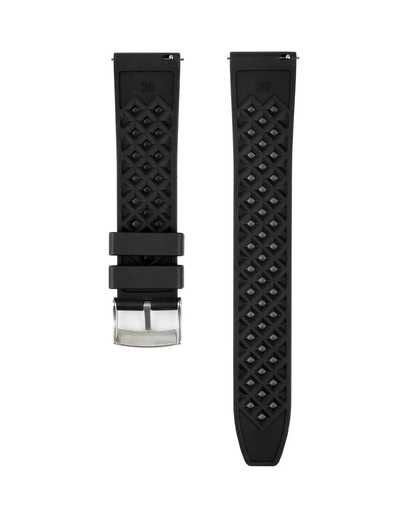 Wenn du auf der Suche nach den besten Kautschukarmbändern im Rauten-Style auf dem Markt zu einem fairen Preis bist, hast du sie gefunden! Der Kautschuk, den wir für unsere Rauten-Bänder ausgewählt haben, ist Fluorelastomer, auch bekannt als FKM oder Fluor. Es ist ein extrem hochwertiger Leistungskautschuk, der auch im Härtetest lange hält, da er hohen Temperaturen, UV-Strahlung und sogar Chemikalien standhält. Nicht zuletzt ist er sehr weich und angenehm zu tragen. Das Armband hat auf der Oberseite ein ausgeprägtes Rautenschraffurmuster und eine eingeprägte rautenförmige Unterseite mit vielen Kanälen, um Wasser und Schweiß perfekt abzuleiten. Diese Armbänder werden mit soliden Schnellwechsel-Federstegen geliefert, sodass du die Armbänder auch unterwegs problemlos wechseln kannst. Die Dornschließe besteht aus gebürsteten Edelstahl 316L und ist mit einer WB-Gravur versehen.