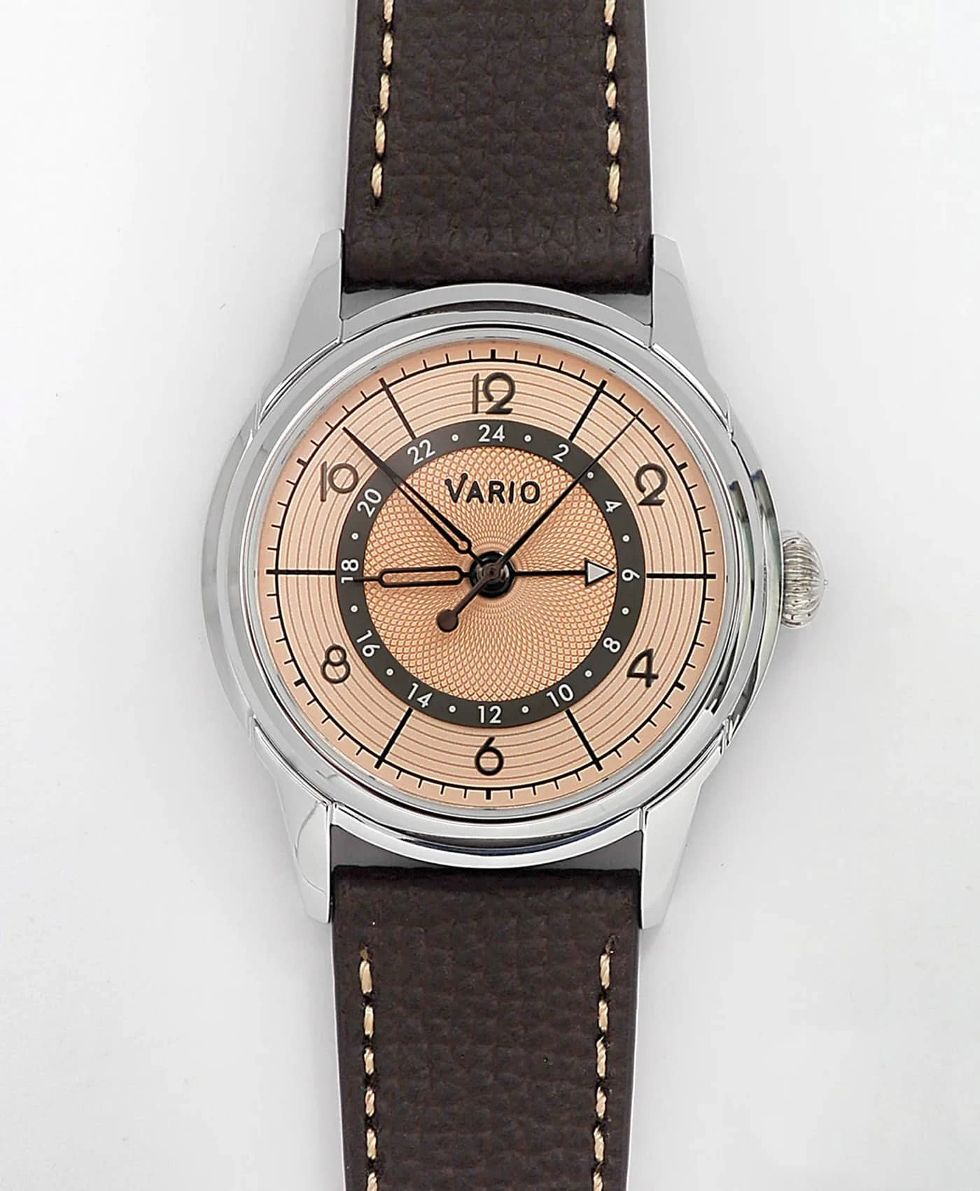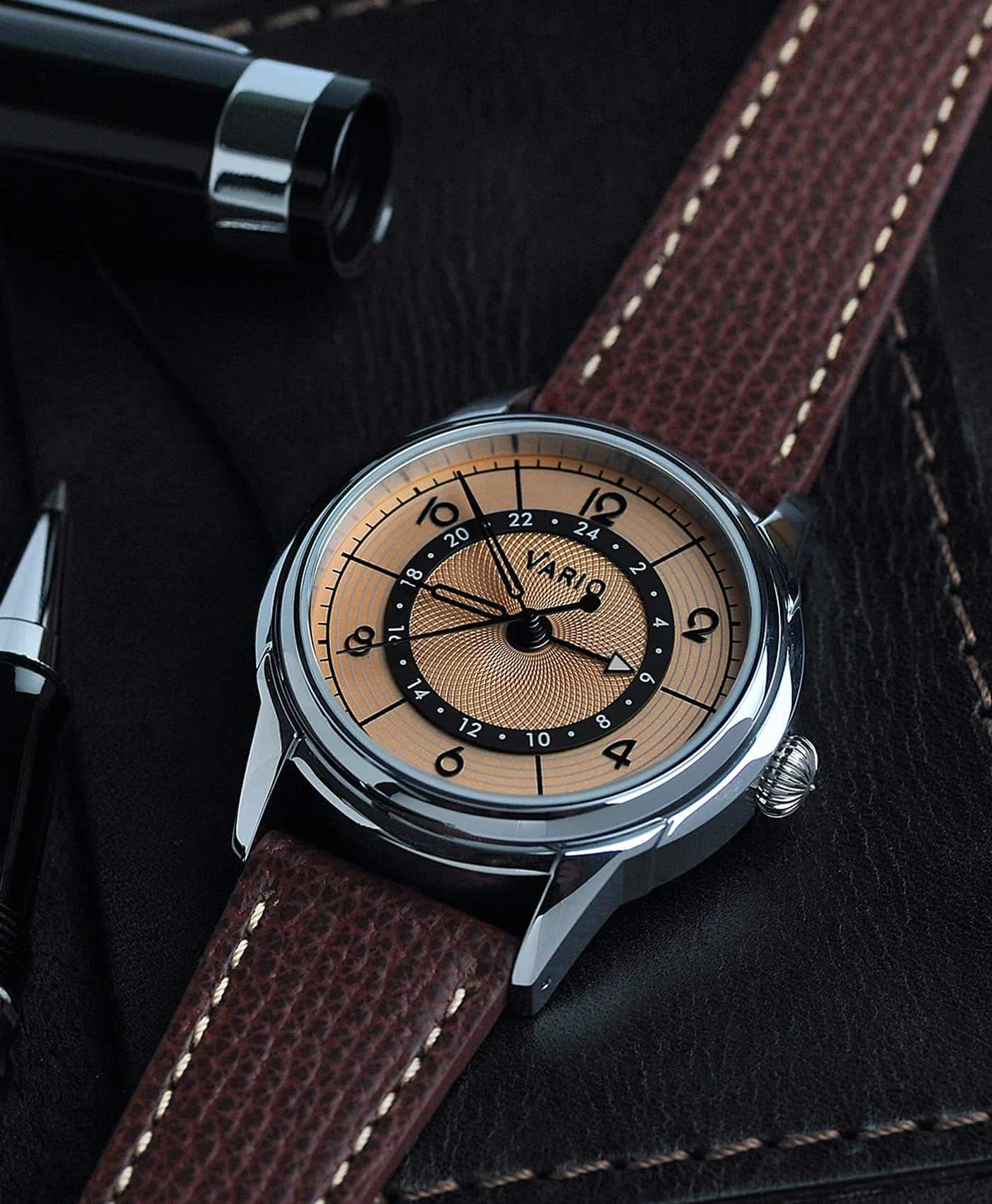 Vario Empire ist Ihr Tor zu einer der größten Epochen des Art-Déco-Designs. Jede sorgfältig gestaltete Traveller’s GMT-Uhr besteht vollständig aus maßgeschneiderten Teilen und beherbergt Ihr Miyota 9075 True GMT-Automatikwerk und passt sich mit ihrem weichen und geschmeidigen italienischen Lederarmband direkt aus der Verpackung an Ihr Handgelenk an.