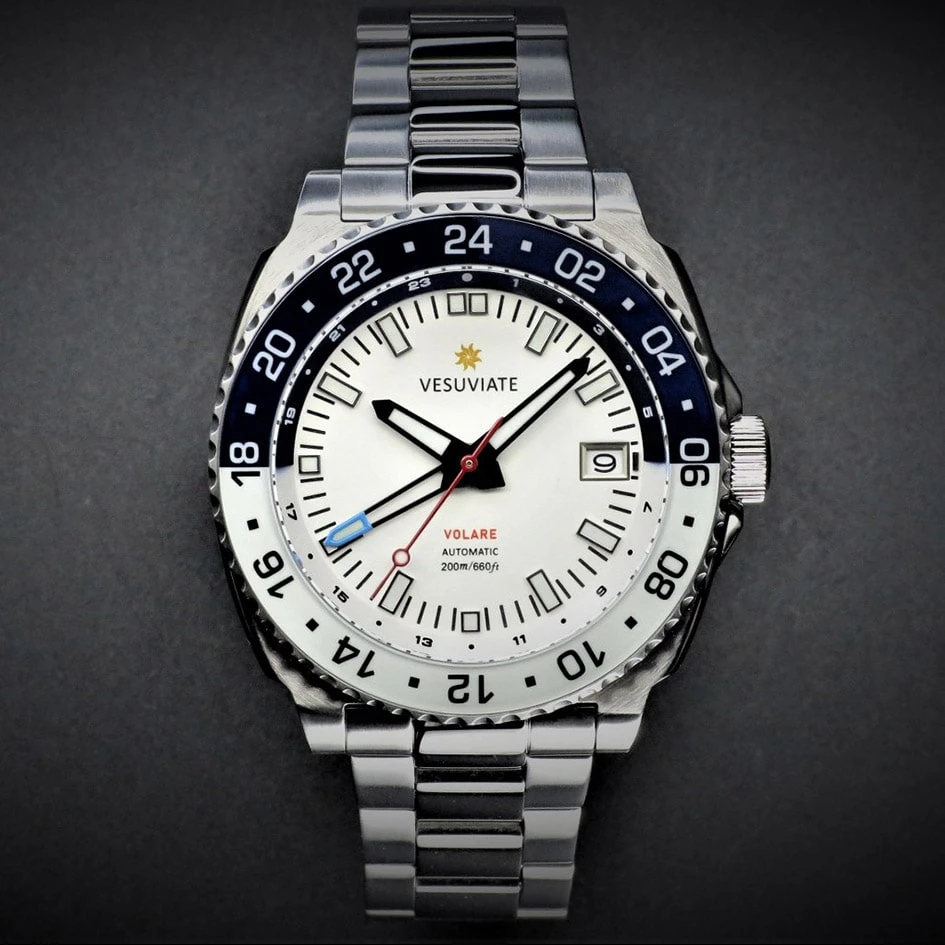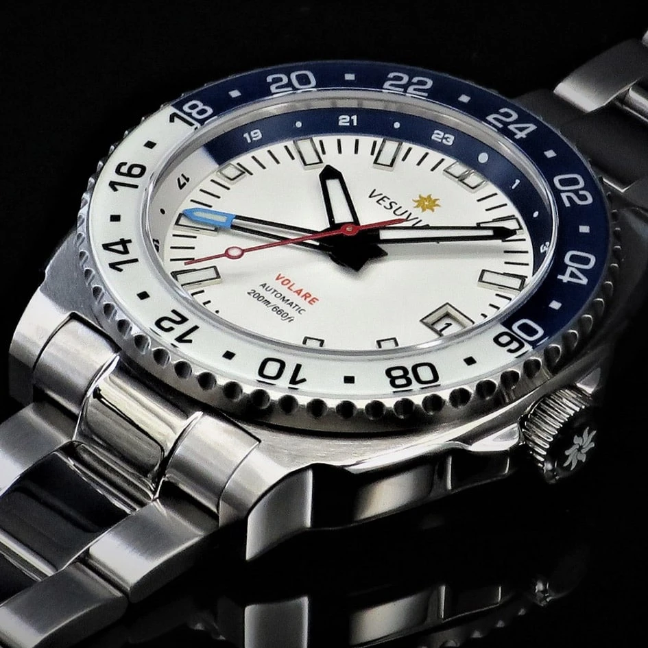DIE VESUVIATE VOLARE ist eine superrobuste GMT-Werkzeuguhr mit japanischem Automatikwerk. Es wird mit einem 316L-Edelstahlgehäuse und -armband mit superharter Oberfläche/einsatzgehärteter thermochemischer Behandlung geliefert, die auf 1.100 HV gehärtet wurde.