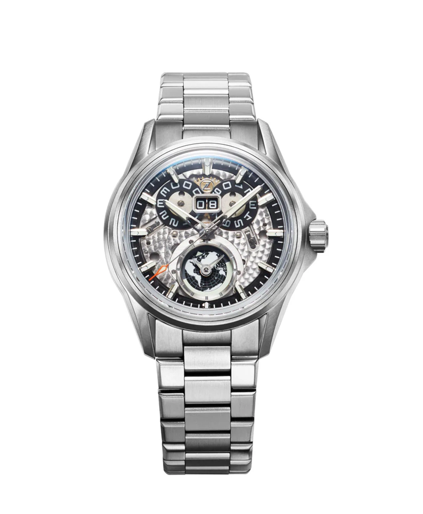 Das gesamte Saphirglas-Zifferblatt hebt zahlreiche Leuchtkomponenten hervor, die mit C3 und BGW9 höchster Qualität von Superluminova gefüllt sind. Jeder Index ist fein poliert und mit einer Dual-Lume-Mischung gefüllt, während die Datumsräder mit Leuchtmasse bedruckt sind. Die Globusdarstellung auf dem Hilfszifferblatt ist ebenfalls vollständig beleuchtet.